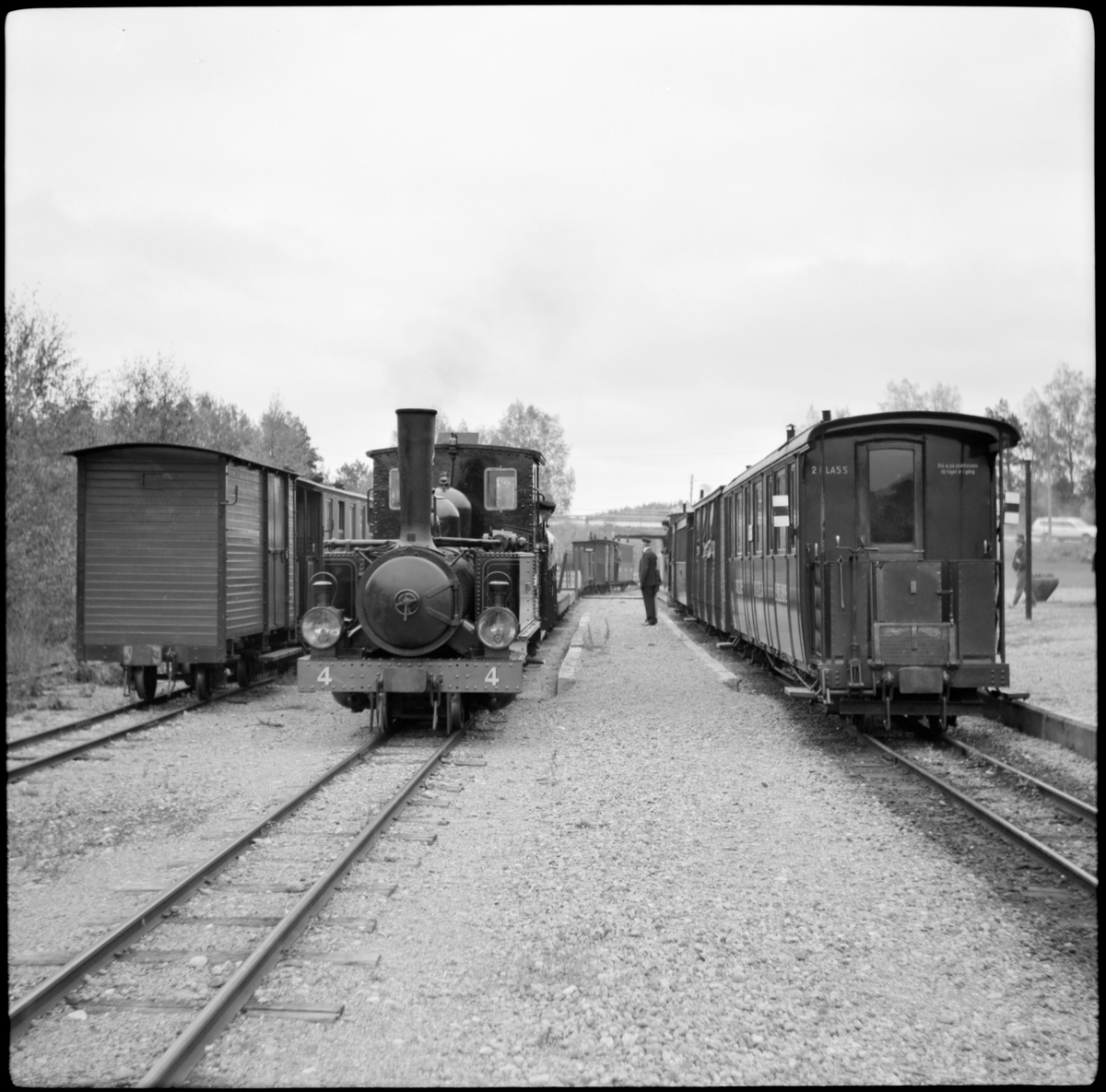 Från vänster; godsvagn, Nättraby-Alnaryd-Elmeboda Järnväg, NAEJ 4 "K M Nelson" och personvagn från Östra Södermanlands museijärnväg.