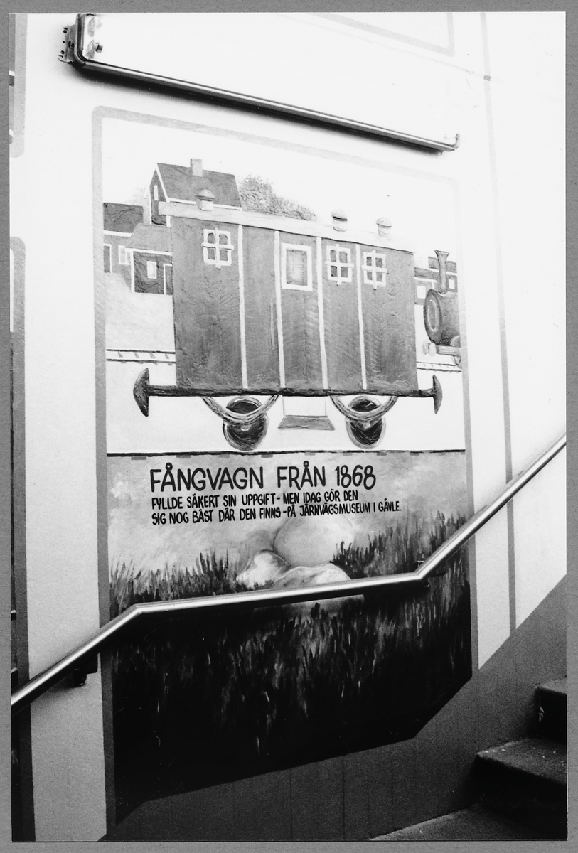Fångvagn. Väggmålning föreställande fångvagn från 1868. Text under vagnen - Fyllde säkert sin tjänst men idag gör den sig bäst där den finns, på järnvägsmuseum i Gävle.