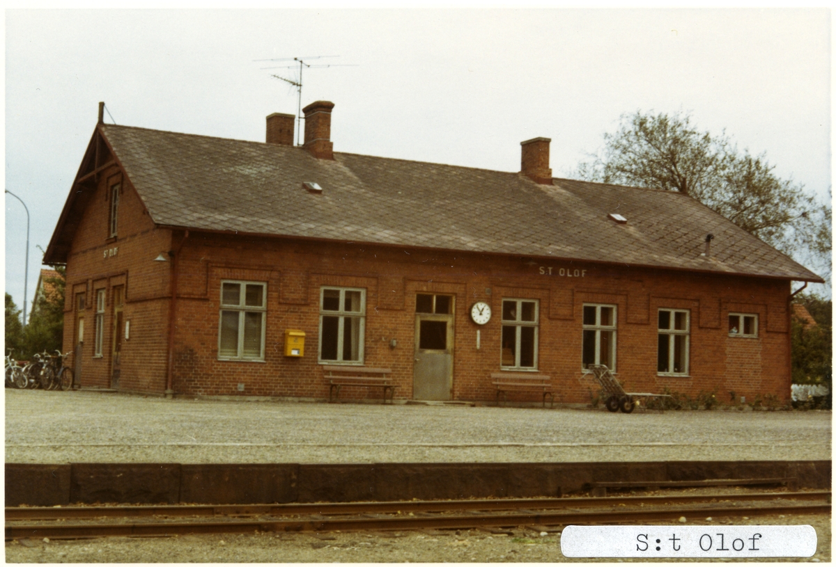 S:t Olof station 1971. Ystad - Brösarps Järnväg, YBJ. Stationen öppnades 1901. Stationshuset byggdes 1901. Sedan 1971 används stationen av museibanan. Gick över till Statens Järnvägar, SJ 1941. Banan elektrifierades 1996.