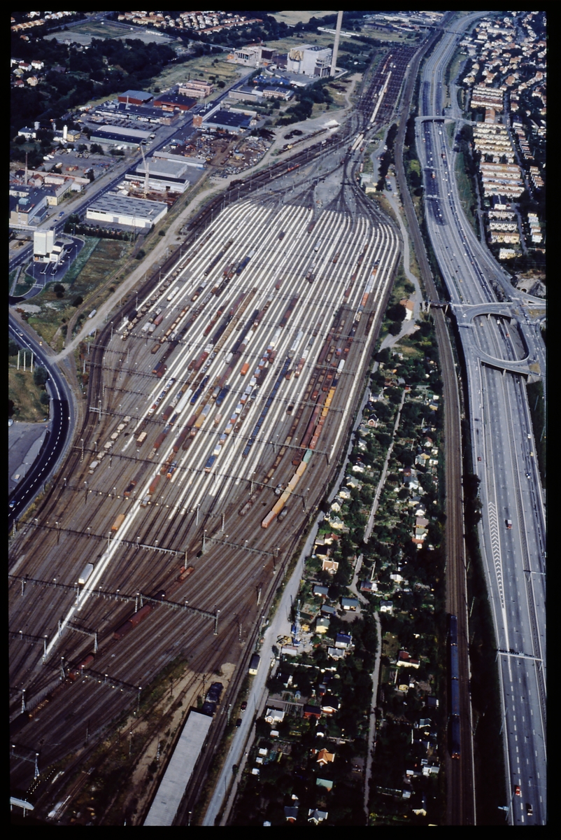 Flygbild över bangård.