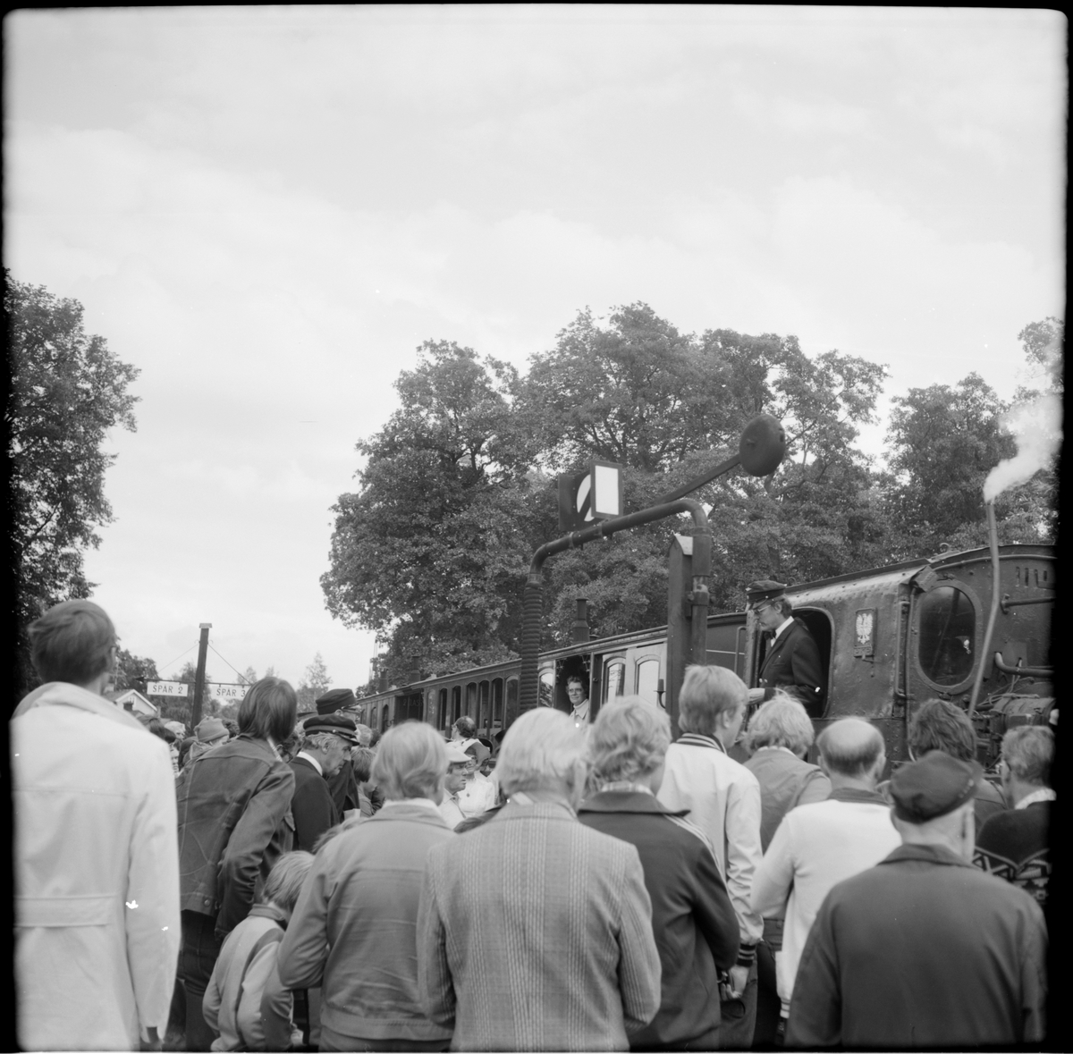 Lokförare på lok 6 "Christina Hjelm" talar inför besökare till Museijärnvägen, Östra Södermanlands Järnväg, ÖSlJ.