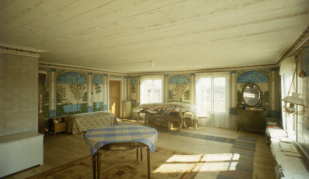 Rumsinteriör, storstuga, på gården Pallars. Väggmålningar, dekormålad taklist och möbler.