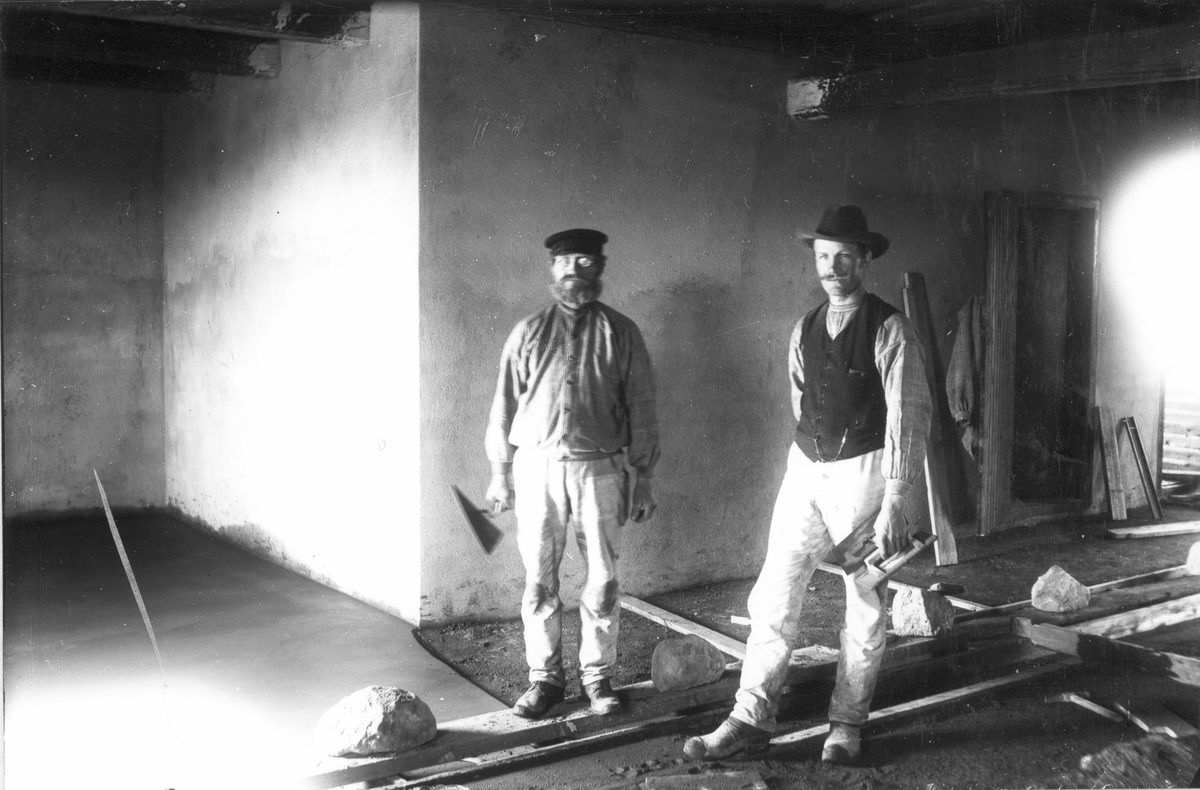 Uppförande av nya ladugården hos Nils-Nils, Lenninge 1:3. Personerna okända.