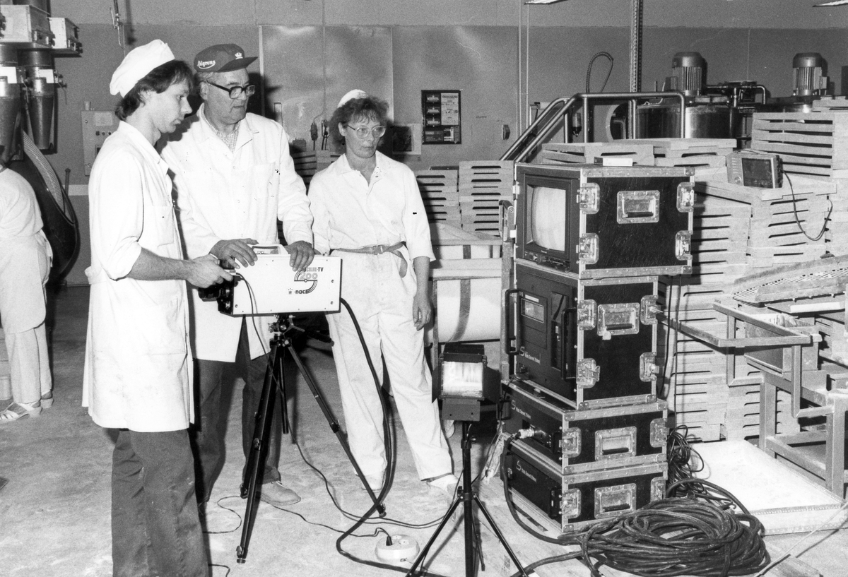 Titel: Tomas Johansson, Mauritz Höljertz från Position Trade Sollentuna och Barbro Johansson vid den höghastighetsvideo som körts för att studera produktrörelserna i dragétrummorna och därmed kunna justera till perfekt inställning.