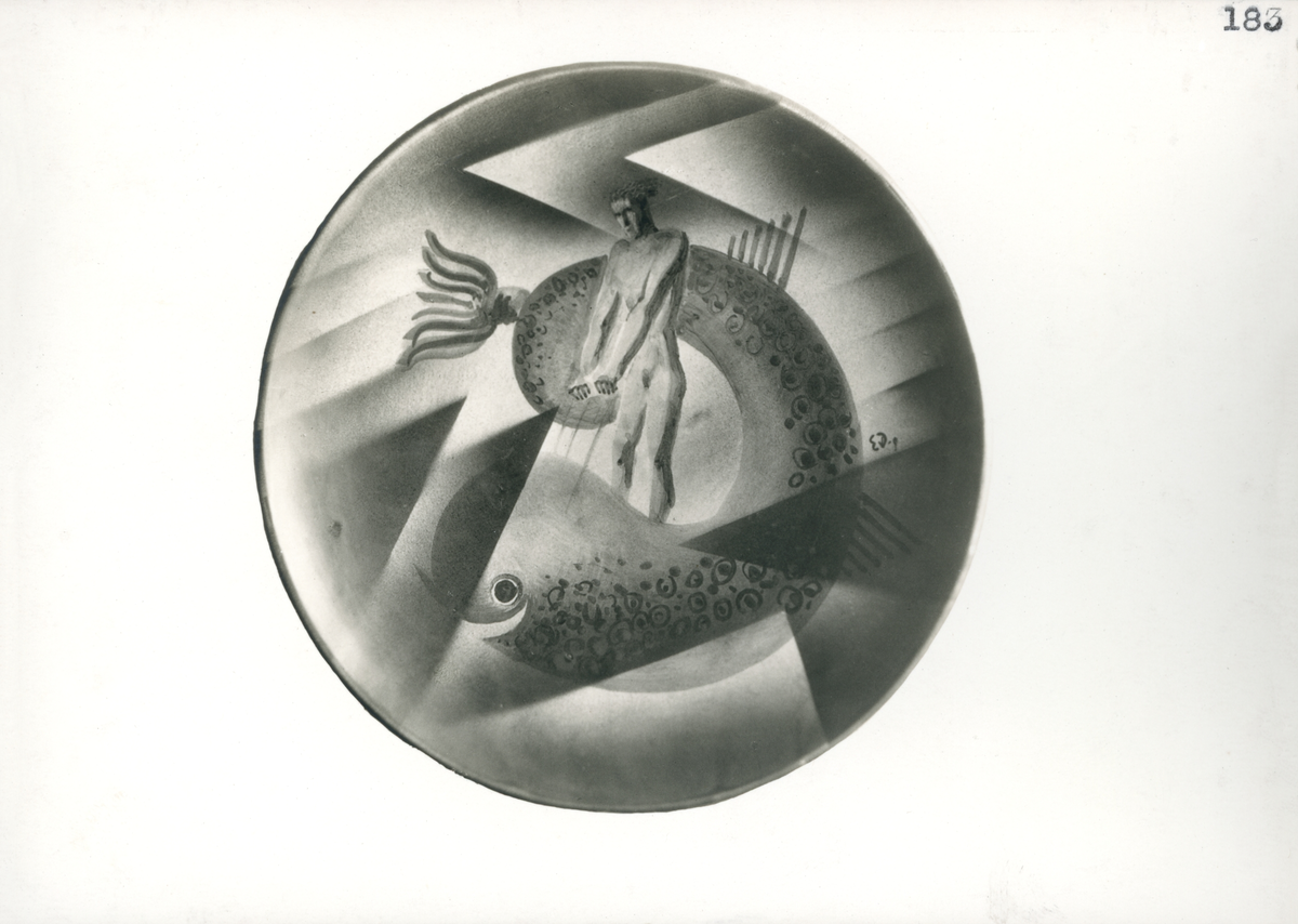 Fat med en man som rider på en stor fisk/sjöorm från Bo Fajans, formgivare Ewald Dahlskog, tidigt 1900-tal.