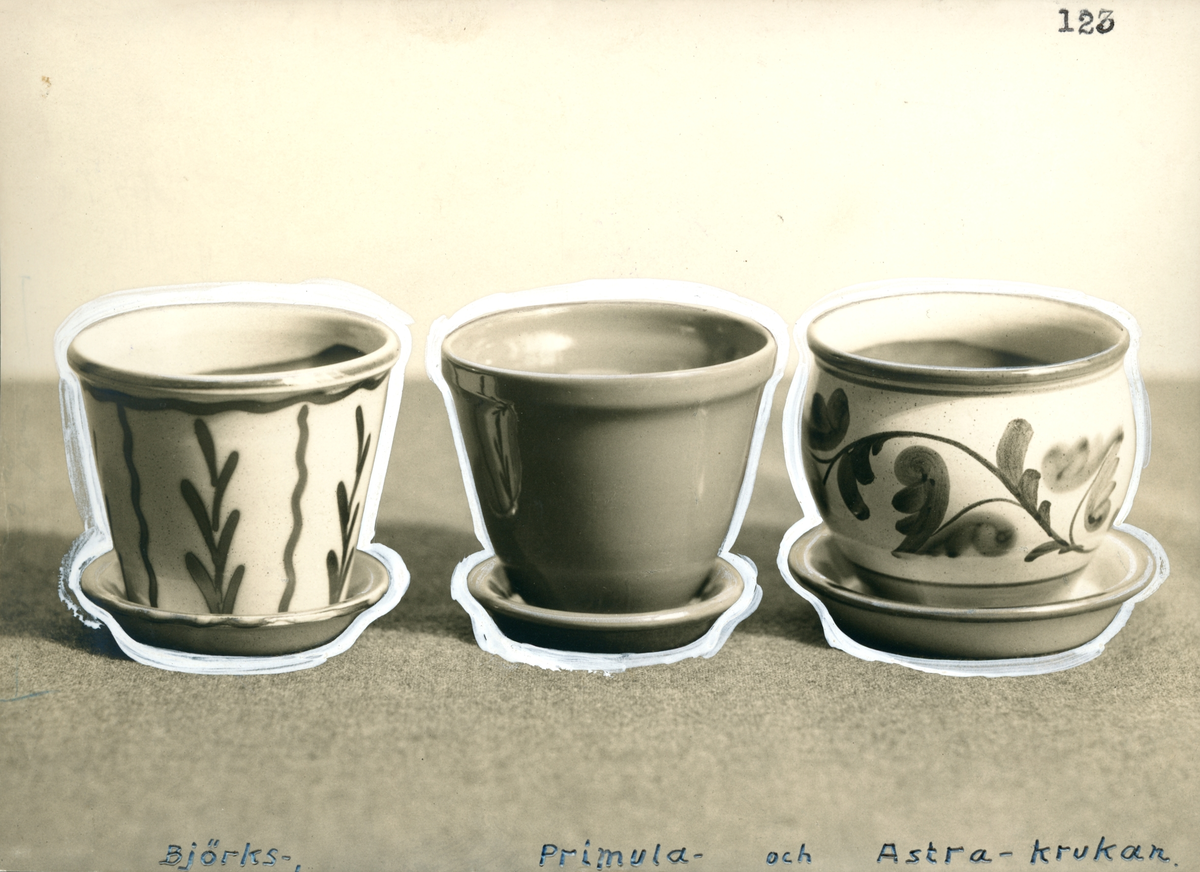Krukorna "Björk", "Primula" och "Astra" från Bo Fajans, namngivna formgivare Eva Jancke-Björk ("Bjök") och Gabriel Burmeister ("Astra"), tidigt 1900-tal.