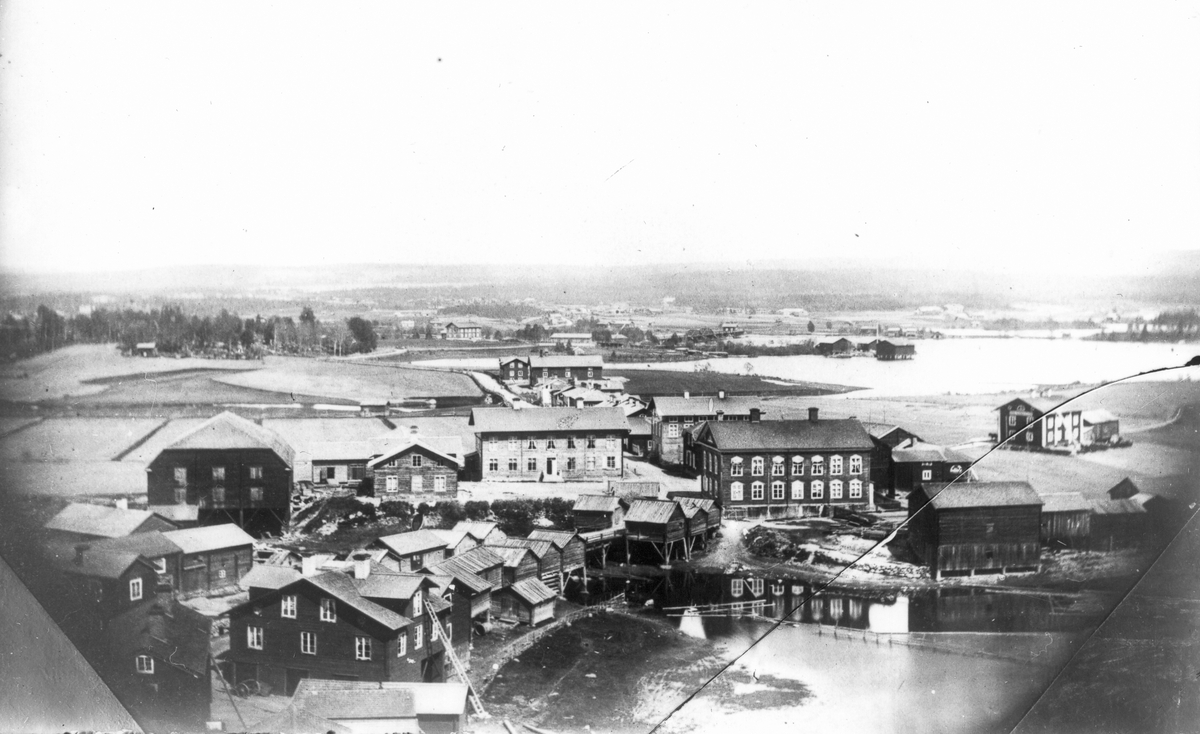 Avfotograferad bild över 1800-talets Bollnäs. Närmast är de gamla kyrkstallarna vid "Lortbäcken". Det stora omålade huset i mitten är det hus där Hagbergs klädafför senare fanns, det stora huset till höger därom inrymde senare Sandberg och Styfs järnhandel. I bakgrunden till vänster Ohnbacken. Husen på stolpar vid vattnet uppe till höger inrymde hamnkontoret m m för båtlinjen över sjön Varpen.