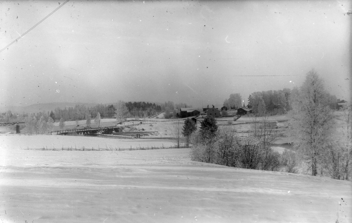 Vintervy över Voxsätter med gamla landsvägsbron.