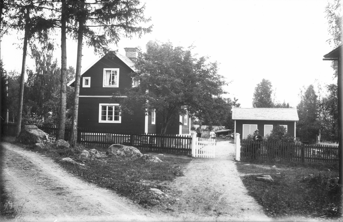 Huset är Lenninge 6:32. På trappan Per Larsson, född 1871, vid staketet till höger Herman Larsson, född 1896. Flickan med cykel kan vara Anna, född 1904.
