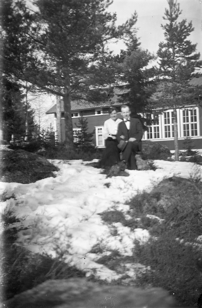 Gamla skolan i Långhed. Lärarinnan fru Olsén med make, konsumföreståndare i Långhed