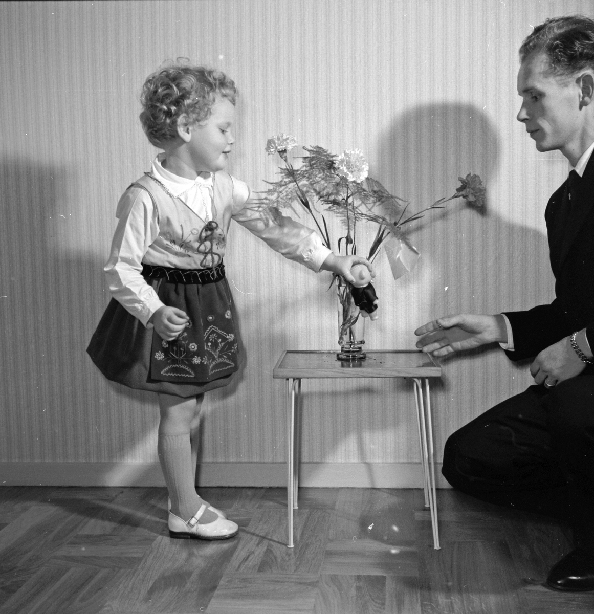 Familjen Göran Mårtensson, en liten flicka i finkläder leker med sin pappa Göran