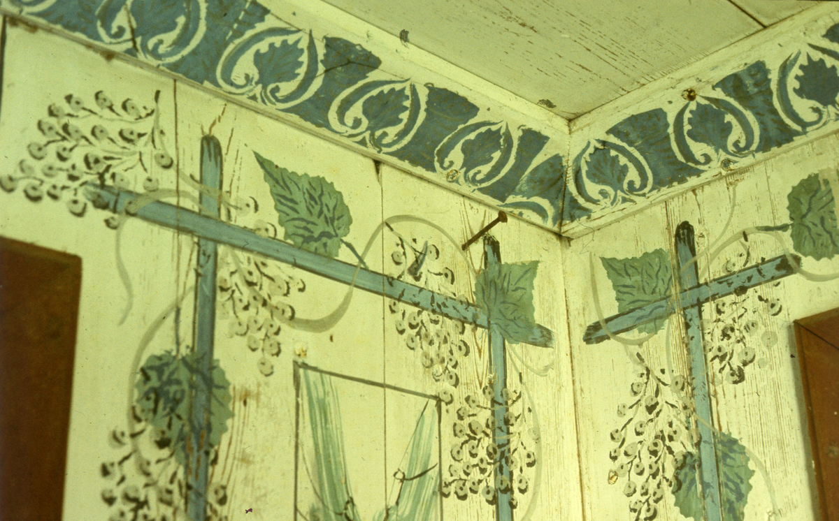 Detaljbild av väggmålning och målad taklist. Vinrankor på spaljéer.