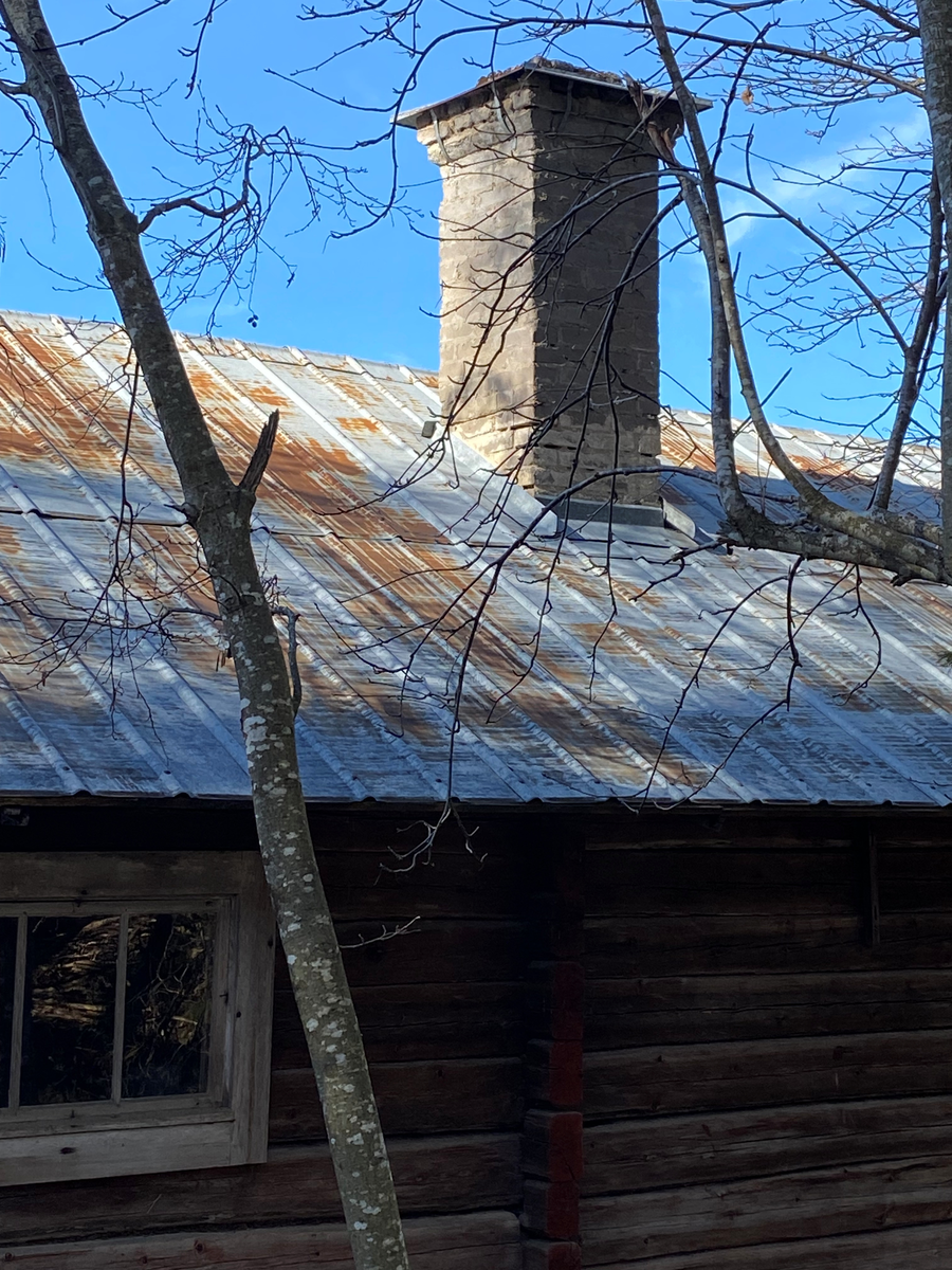 Bostadshus uppfört i timmer, takbeklädnad av pannplåt, murad skorsten, solblekta fasader.