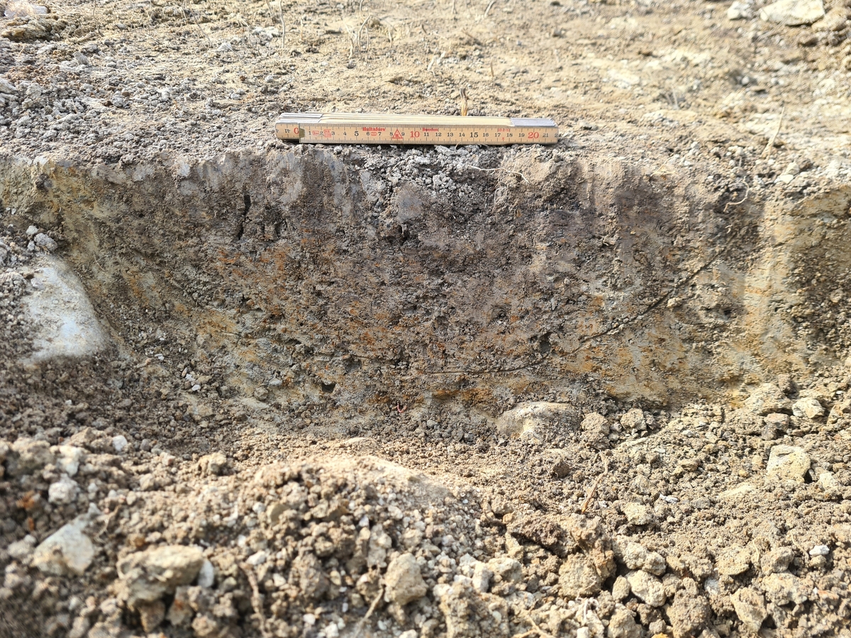 Sektion genom stolphålet AS211, som vid närmare anblick utgörs av två stolphål. Foto mot väster. Från arkeologisk undersökning i form av schaktningsövervakning i Hede, Hälsingtuna socken, Hudiksvalls kommun.