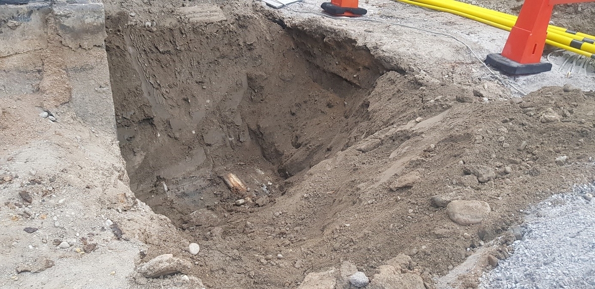 Nedre delen av ett djupschakt med träplankor/eventuell rustbädd i botten. Från arkeologisk undersökning i form schaktningsövervakning vid Stadsbiblioteket, Gävle stad och kommun. L1951:5633.