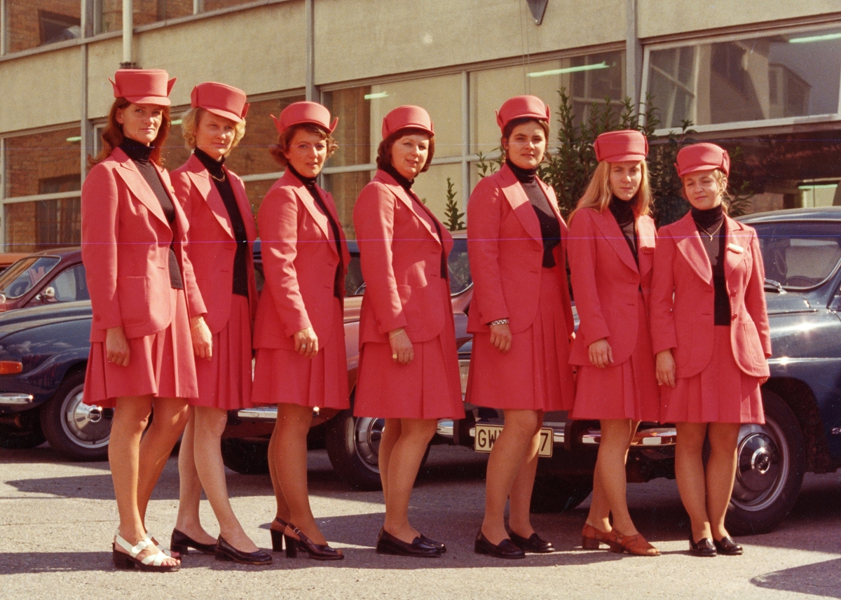 Bilpatrullen. 7 kvinnor idräkt med kjol, kavaj samt keps i rött framför bilar uppställda utan för Läkerolfabriken i Gävle.