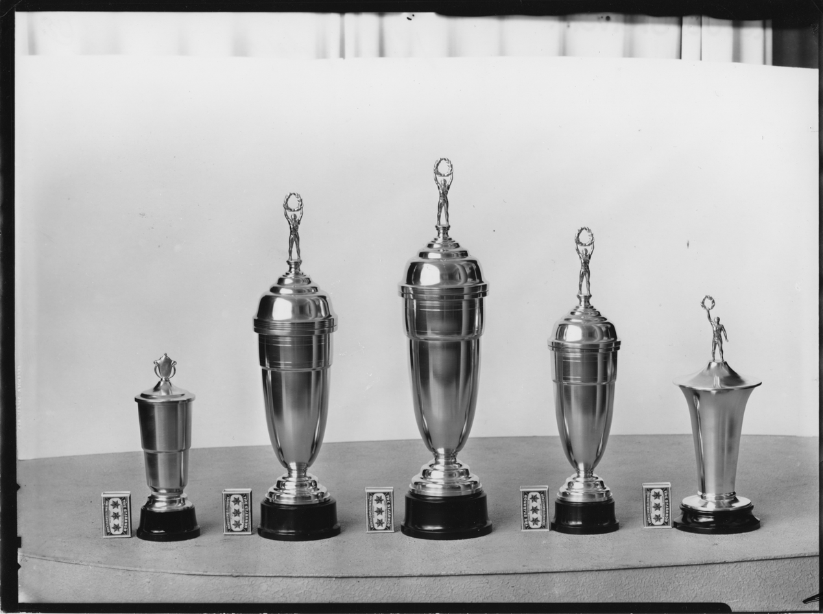 Läkerol prispokaler. 5 stycken i olika storlek. Med svarta fötter.