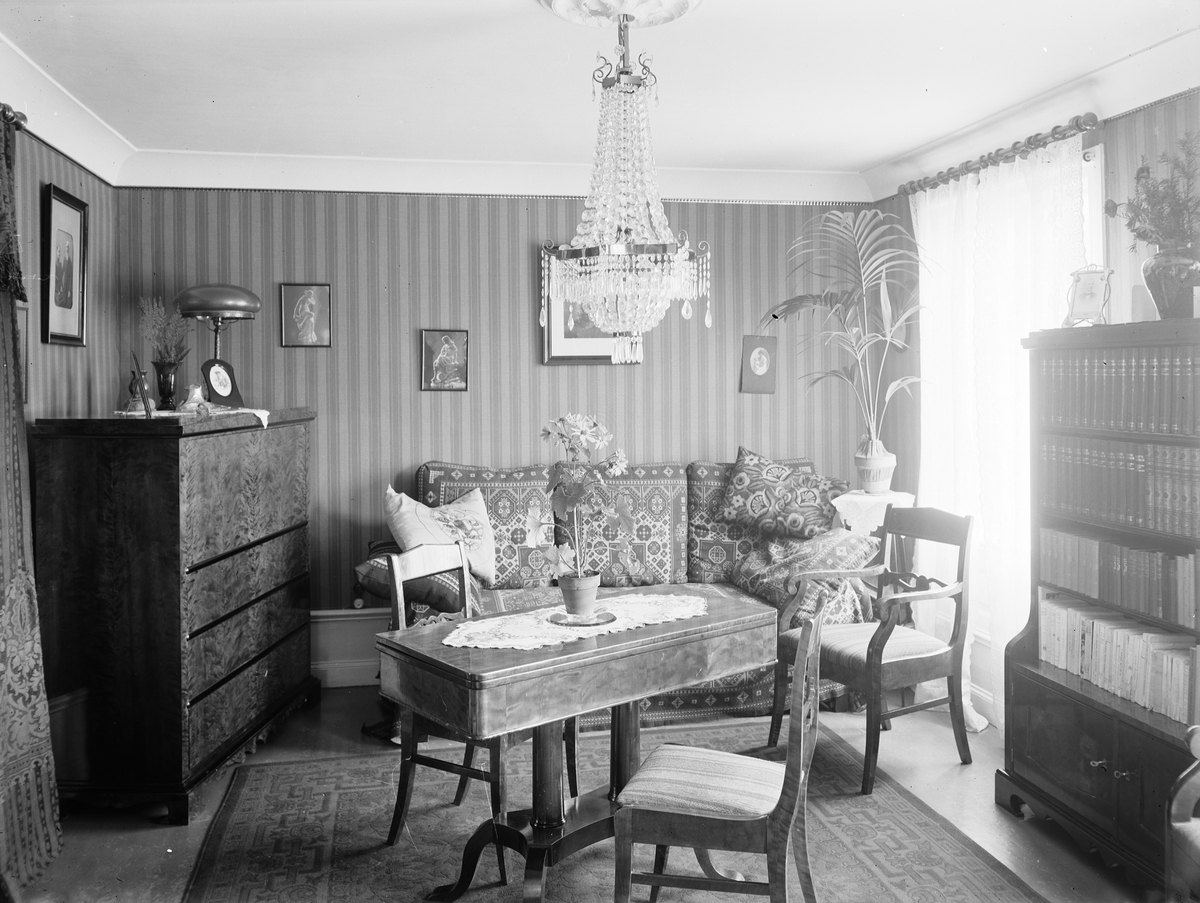 Titel: Hemma hos Mossberg på Brynäs. Enligt 1920 års adresskalender: Kamrer J. Mossberg. Enligt 1930 års adresskalender: Banktj. m. Astrid Mossberg. Bomhusgatan heter nu Styrmansgatan