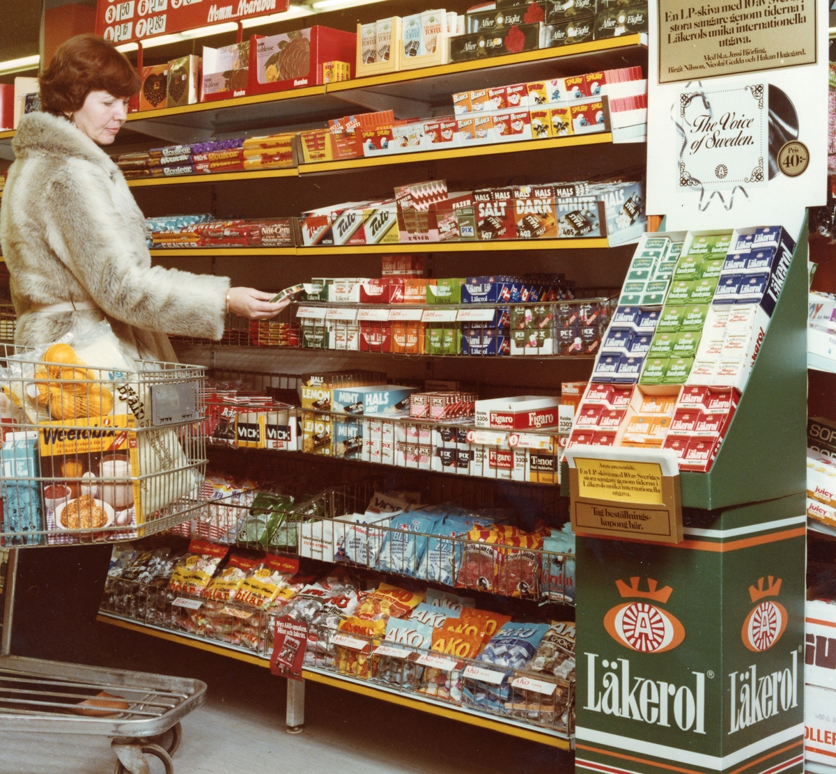 Marknad Sverige. Läkerolställ (papp) vid säljhyllor.