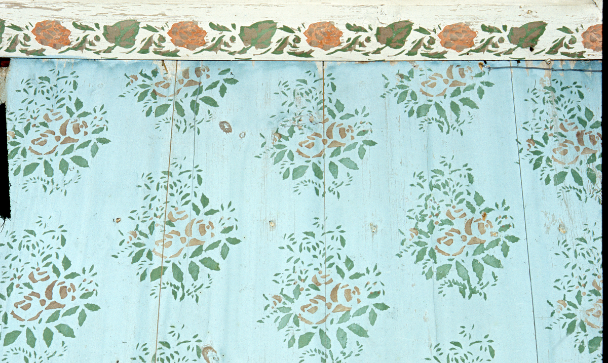 Väggmålning. Blå bakgrund. Rosor. Målad taklist.