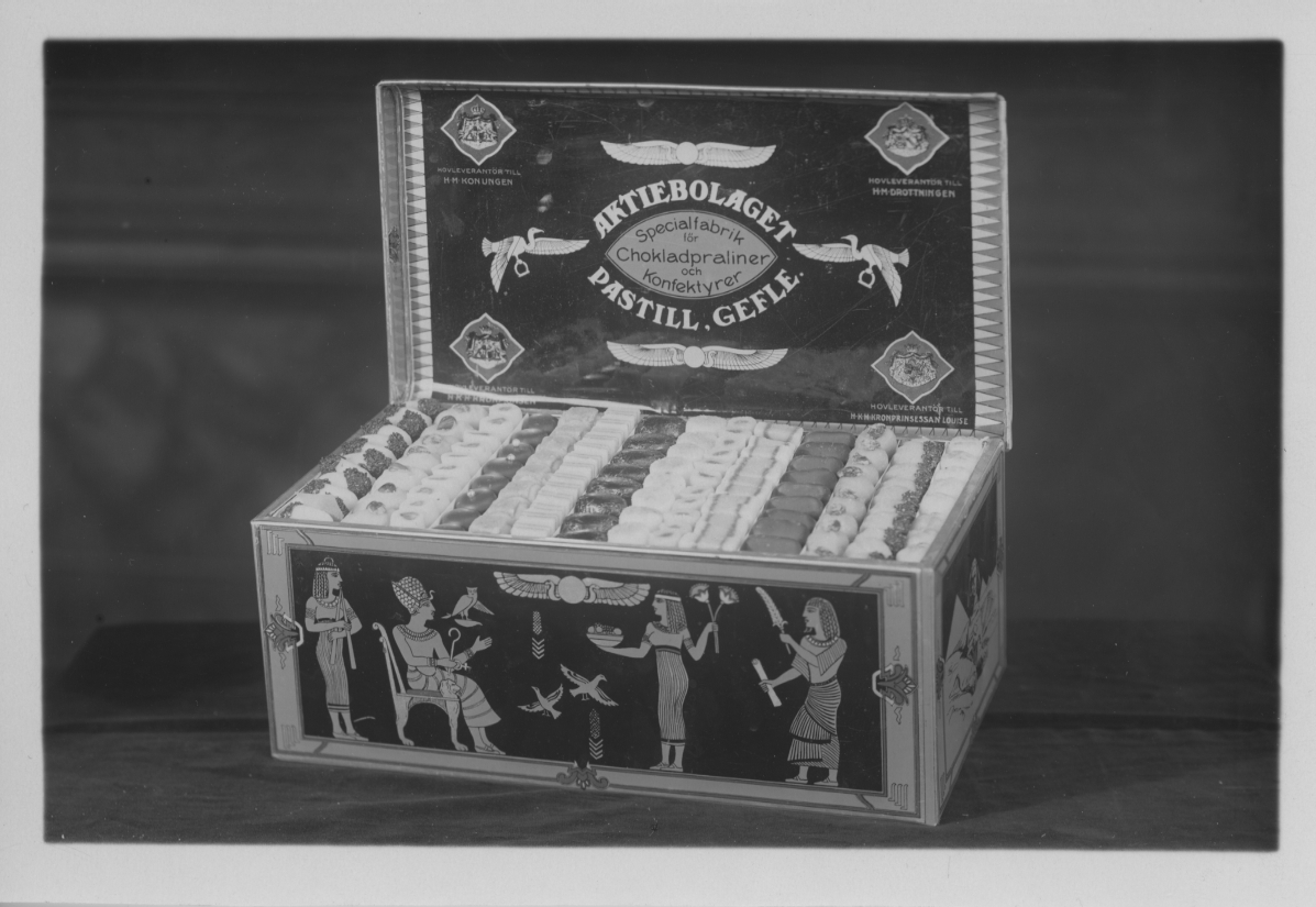 Dekorerad låda med praliner från någonstans mellan 1916 och 1933 då pastillfabriken fanns.