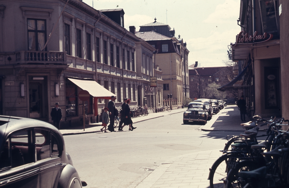 Drottninggatan - Hattmakargatan i Gävle. Byggnaden längst bort är Länsmuseet Gävelborg.