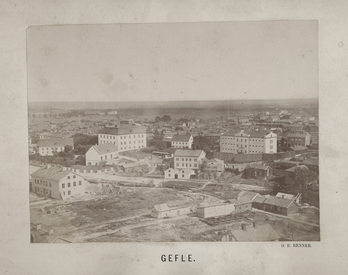 Vy från kyrktornet i Heliga trefaldighets kyrka. 1870-tal. Gävle fängelse och Gävle slott.