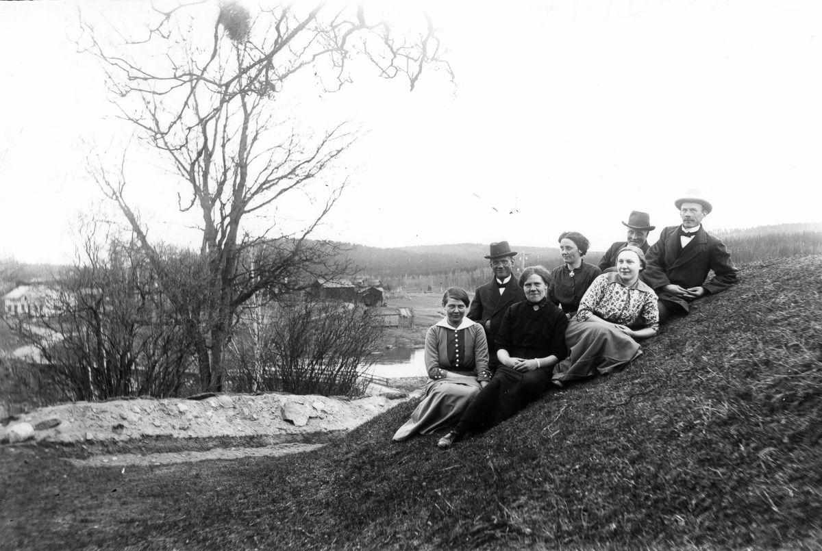 På Skinnar-kullen. Främre raden från vänster: Skinnar-Brita (Persson), okänd, Edla Olsson. Bakre raden från vänster: okänd, Nyhems-Marta från Hällbo, Norrgårds Lars Nilsson i Hå och Jonas Jonsson i Hå (riksdagsman, kallad "sub 9"). Observera skyttegraven!