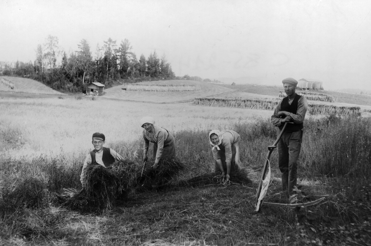 Arbetsbild tagen vid "Nils Nils boerne" (mitt emot Kattnäs). Från vänster: Nils-Nils Nils (Johansson), Svartbo-Beda (Beda Lundgren), Jenny Eriksdotter (senare gift i Per-Jöns) och Jennys bror Erik Joel Eriksson. Foto 1916-1918.