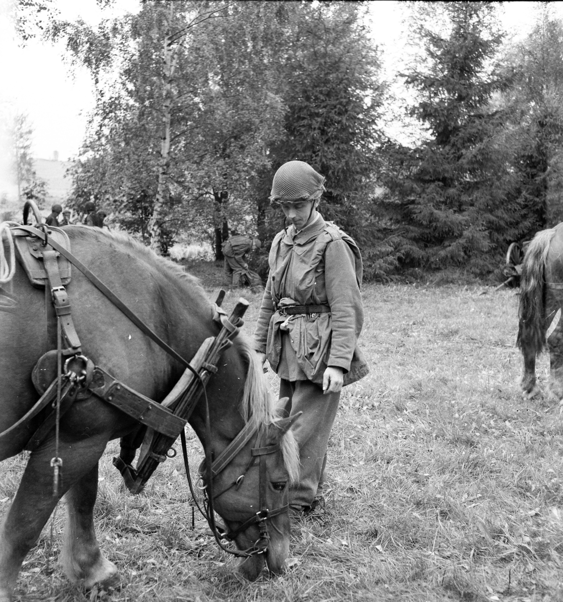 En soldat från Hälsinge Regemente, I 14, tillsammans med en häst