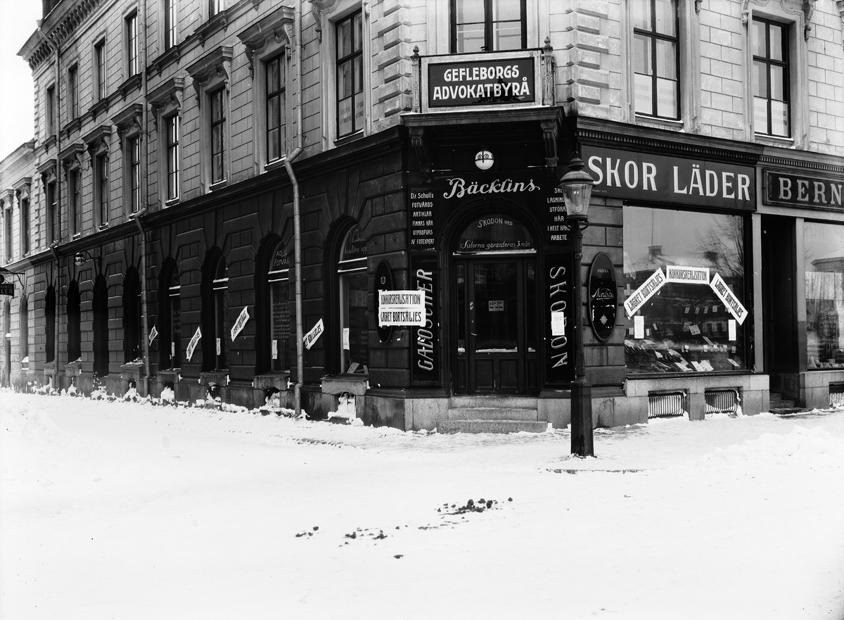 Bäcklins Skor och Läder. Konkursrealisation. Lagret bortskänkes. Bryntes möbelaffär, Bernsons Garn och Gefleborgs Advokatbyrå