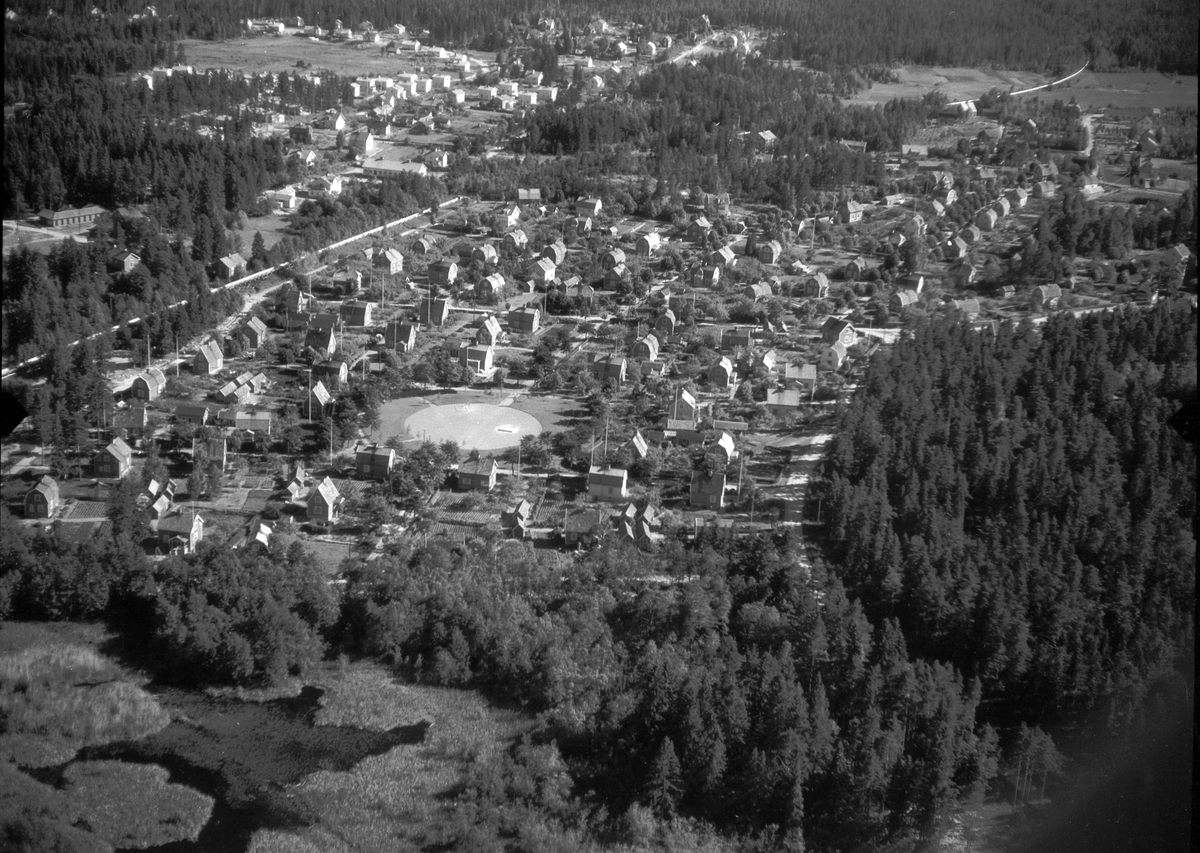 Orion-området, Bomhus, med Depkens väg som löper horisontellt i mitten av bilden. Den runda platsen är Siriusplan.