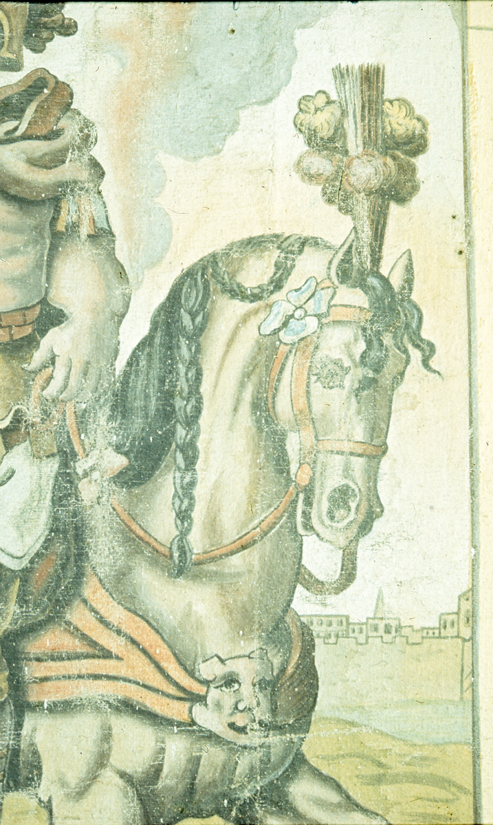 Detaljbild av väggmålning. Kvinna iklädd klänning.