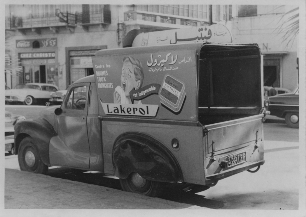 Bil med reklam för Läkerol med arabisk text. Från 8/1 1957.