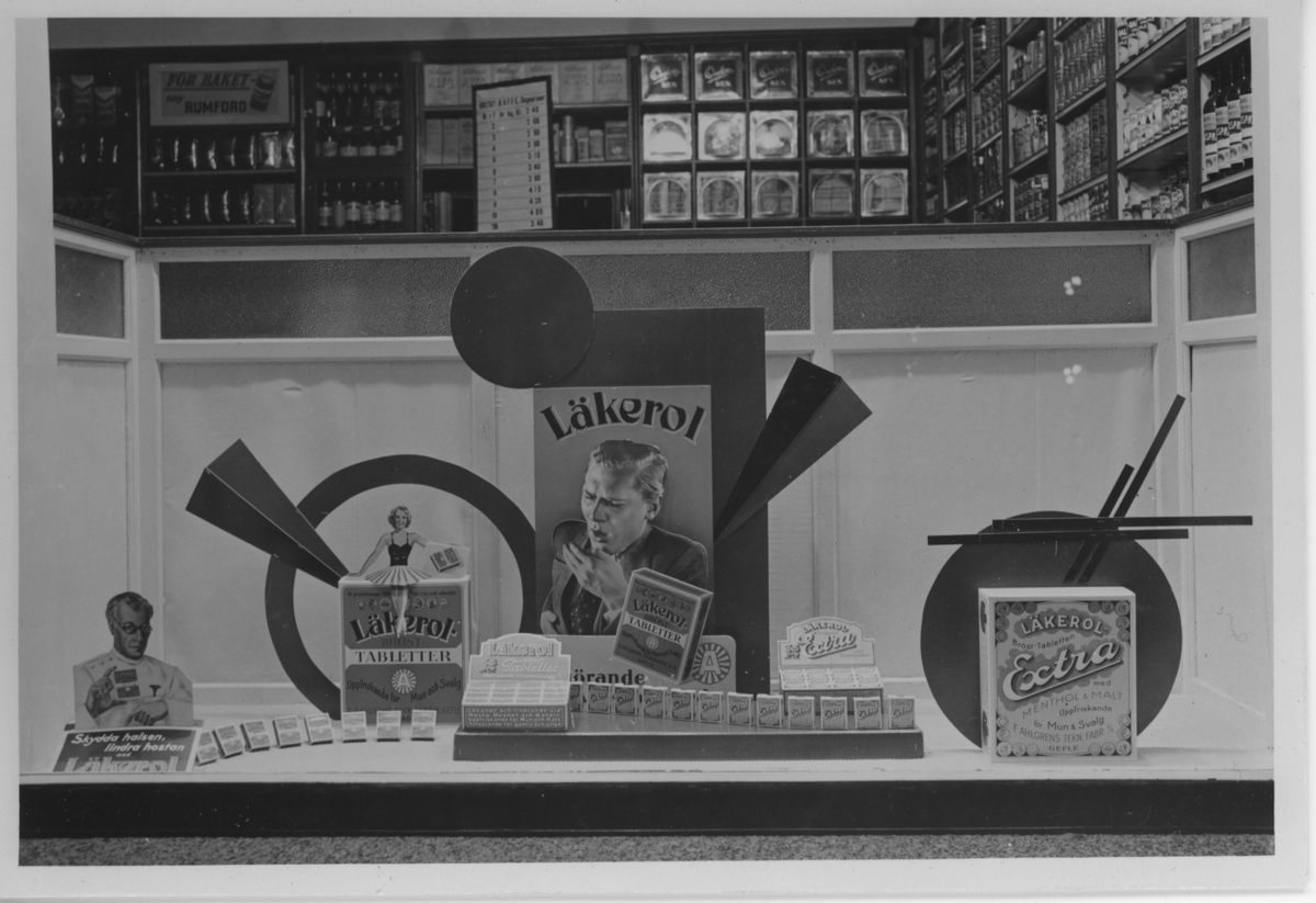 Skylfönster med reklam för Läkerol. Kristinehamn våren 1939.