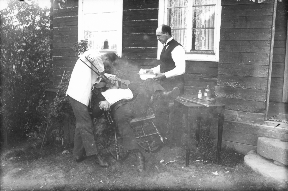 "Tandutdragning", till höger Målar-Emil (Nilsson), de övriga är mjölnare Olssons pojkar från Lenninge 14:2.