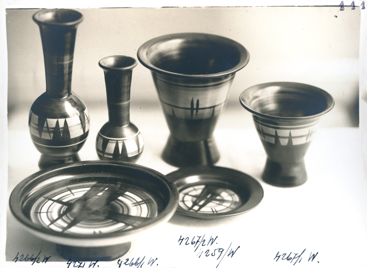 Vaser, tallrik och fat från Bo Fajans, formgivare Maggie Wibom, tidigt 1900-tal.