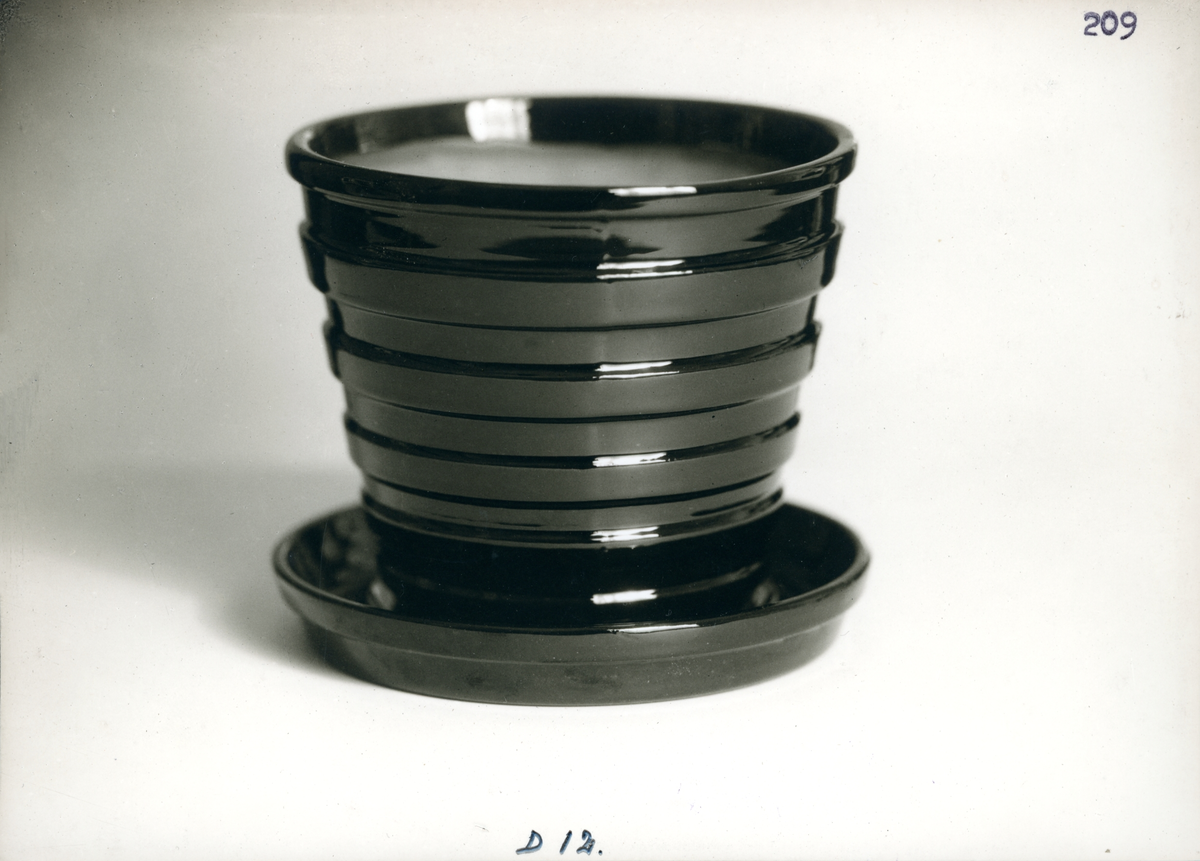 Kruka från Bo Fajans, formgivare Ewald Dahlskog, tidigt 1900-tal. Brun glasyr på ränderna och svart glasyr mellan dem.
