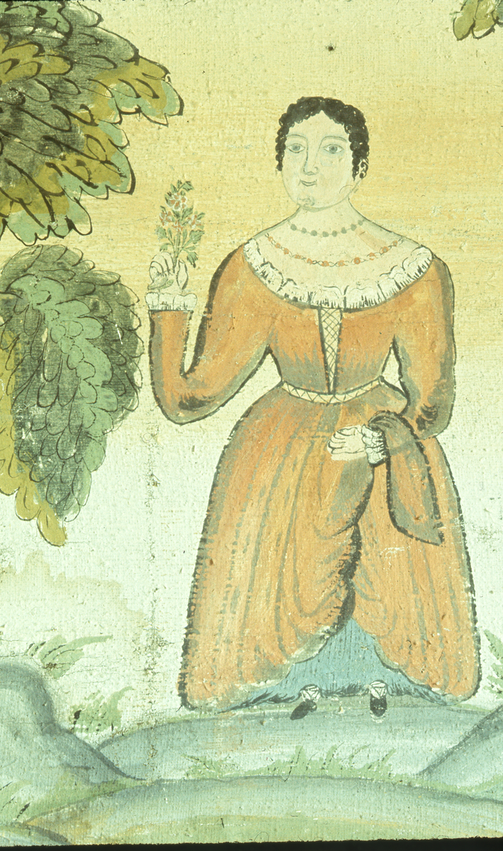 Detaljbild av väggmålning. Kvinna iklädd klänning.