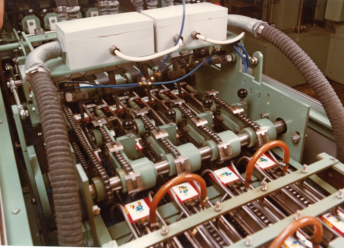 Packningsmaskin, Shuur. Vikning och limning av Smurfaskar "askämnen" innan pastillena fylls i askarna för att sedan cellofaneras och packas i tråg.