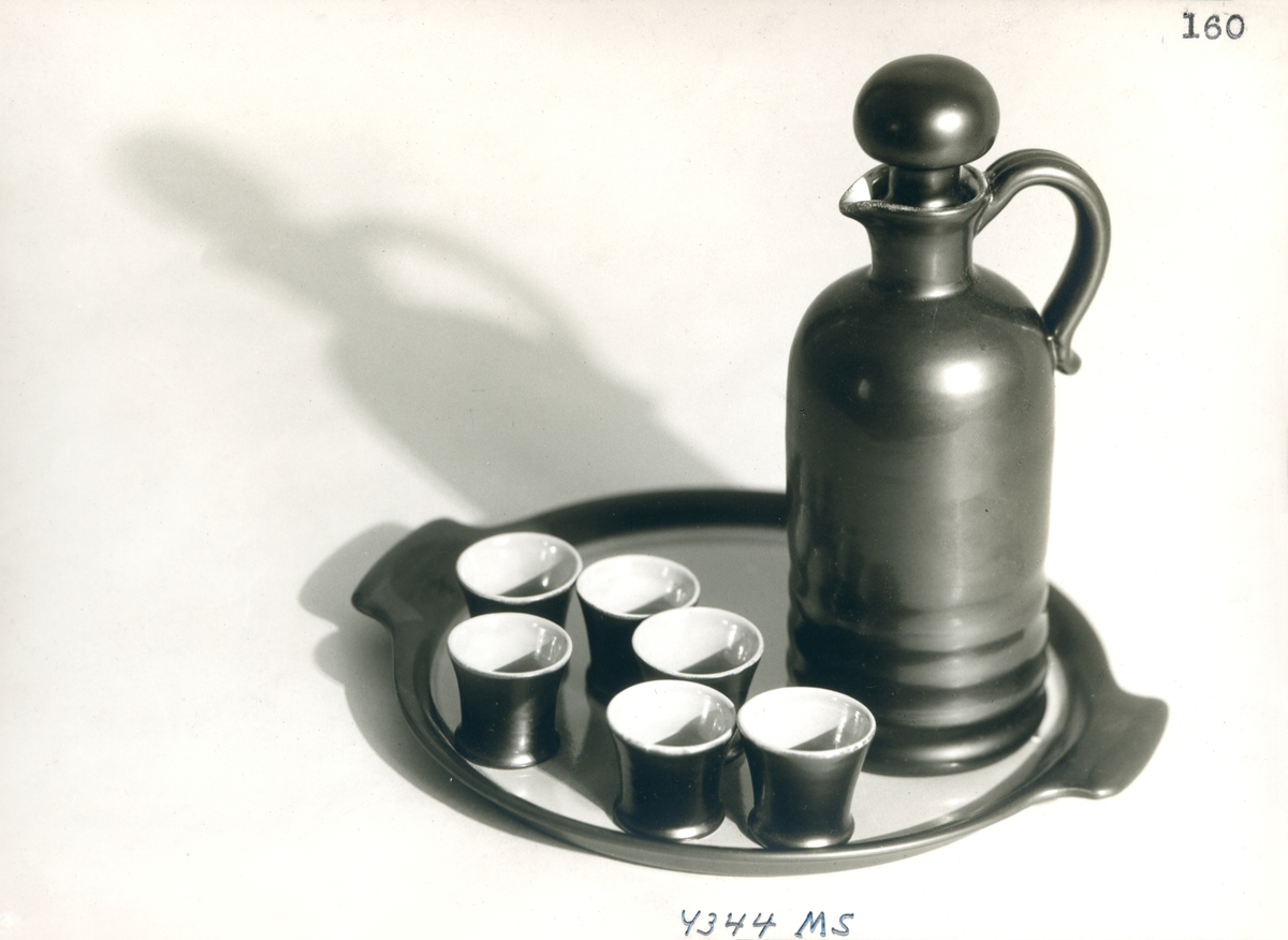 Likörkrus med serveringsfat och koppar från Bo Fajans, formgivare Eva Jancke-Björk, tidigt 1900-tal.