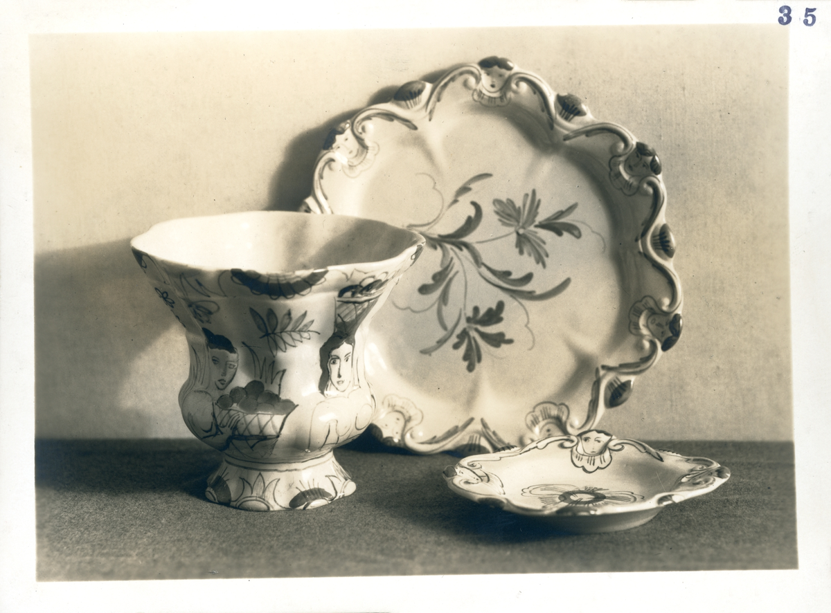 Stor fruktskål av modell 1089 A, stort fruktfat av modell 1085 A samt fruktassiett av modell 1093 A från Bo Fajans, formgivare Alan Ebeling tidigt 1900-tal.