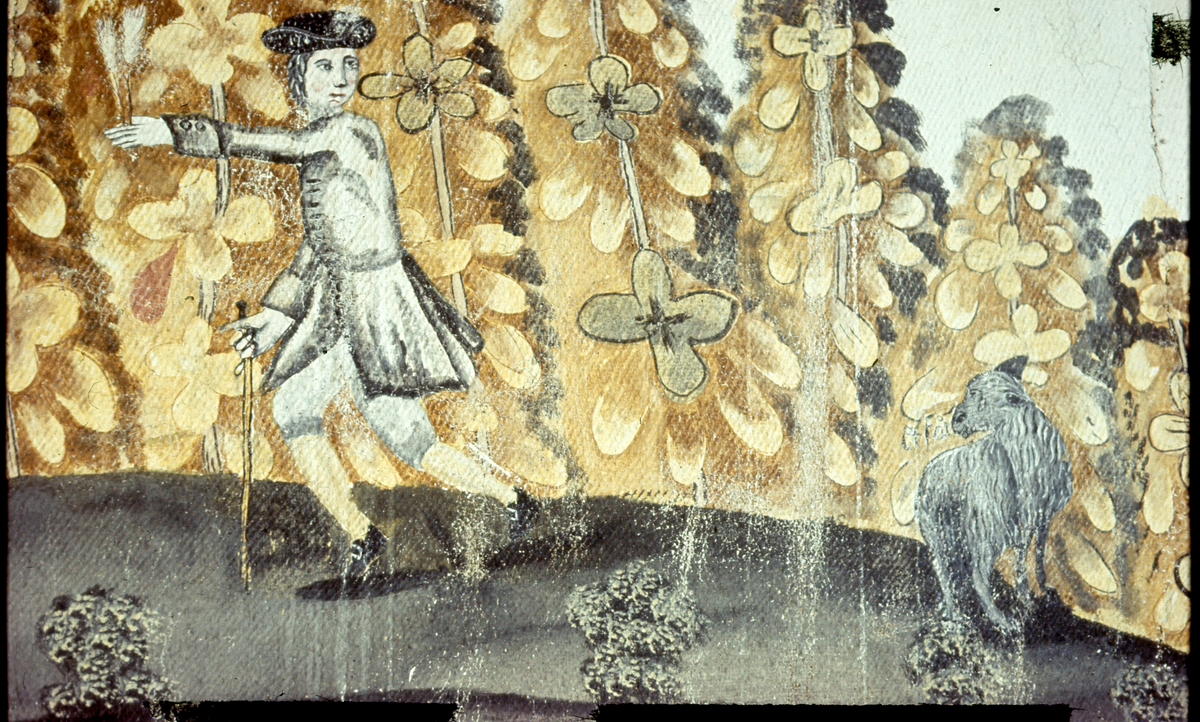Del av väggmålning. En man, herde, med en get framför bleknande löv.