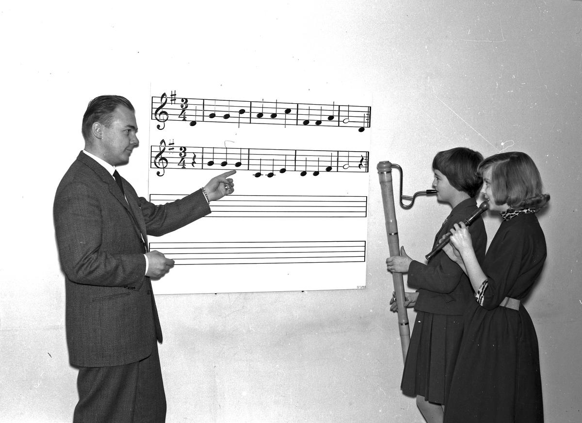Musiklektion, två tjejer med olika modeller av blockflöjter