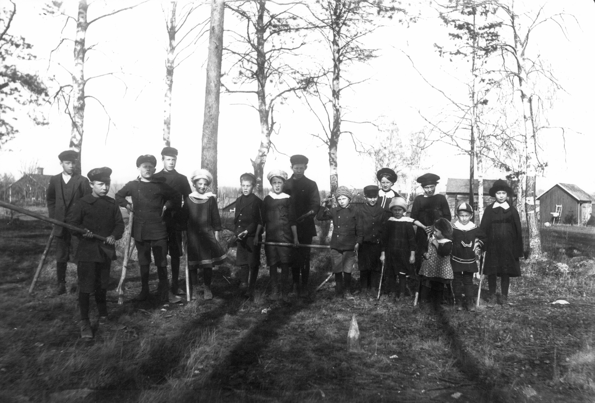Barnen från Stensvea "slår munk". Från vänster: Nils Johansson (tre gånger Nils) från Nils-Nils, Lenninge 1:3 (född 1901), okänd, Seth Johansson, Lenninge 5:31 (född 1901), Karl Olsson, Lenninge 4:47 (född 1900), Stina Johansson, Lenninge 1:3 (född 1906), Erik Olsson, Lenninge 3:13 (född 1906), Anna Svedlund, Lenninge 6:30 (född 1906), Evert Svedlund, Lenninge 6:30 (född 1900), okänd, Verner Hall, Lenninge 10:1 (född 1904), Ebba Wikström från Målars, okänd, Karin Olsson, Lenninge 3:13 (född 1904), Olle Svedlund, Lenninge 6:30 (född 1911), Johan Johansson, Lenninge 1:3 (född 1909) och Elsa Persson (Östbergs-Elsa), Lenninge 6:53 (född 1904).