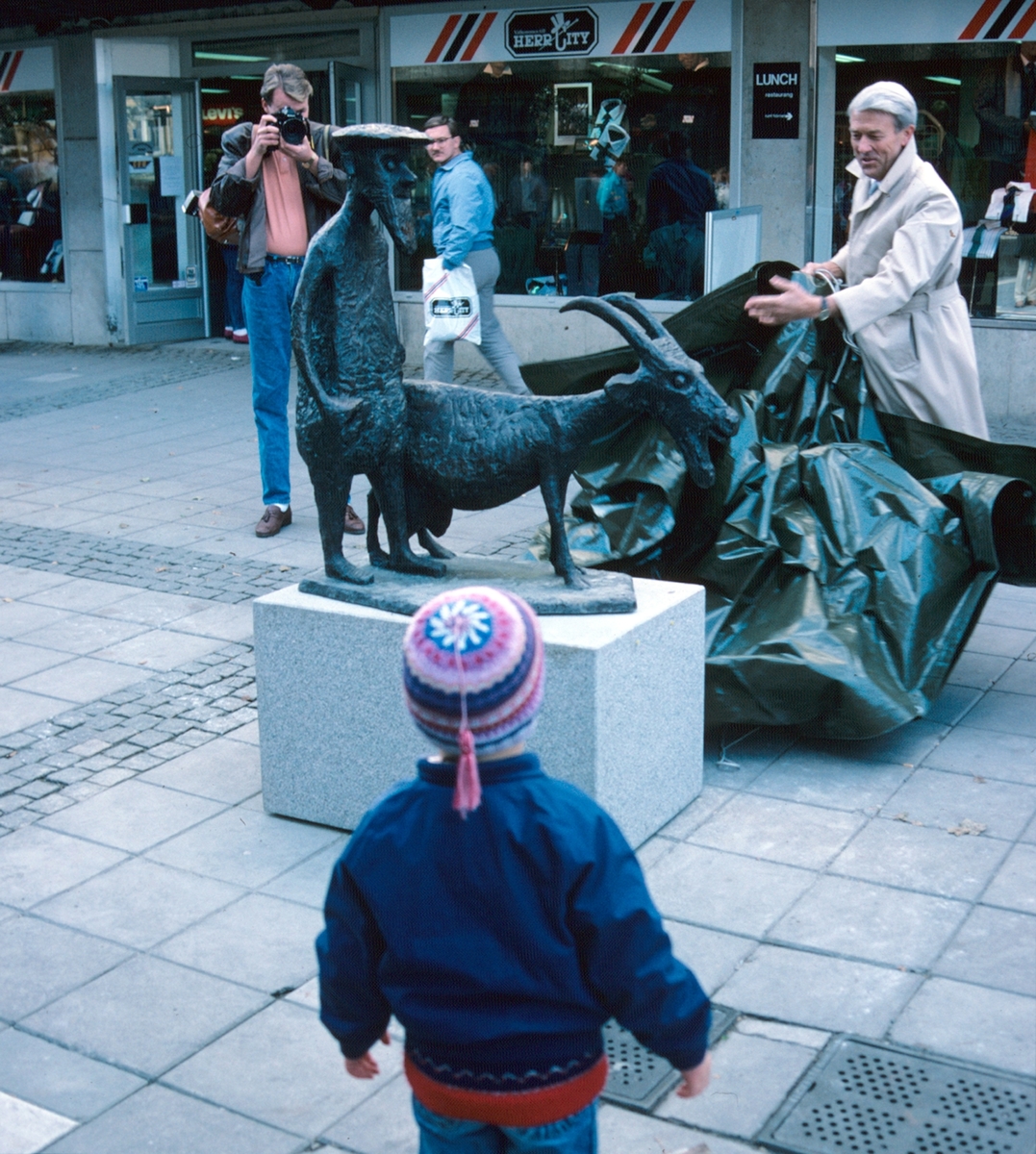 Åke Gillstörm inviger på Drottninggatan statyn Getgubben av Allan Runefelt, 1922-2005. Bronsskulptur, gubbe 1 m hög, geten 0,6m. Stor likhet mellan mannen och hans husdjur visar den lilla människans utsatthet i en allt hårdare värld som understryks av dess placering mellan två stora byggnader. Gåva av GDJ-fonden 1988 till Gävle kommun.