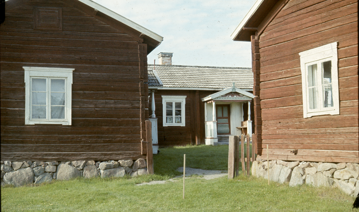 Gårdsanläggning. Tre byggnader i bild. Rödmålade timmerhus.