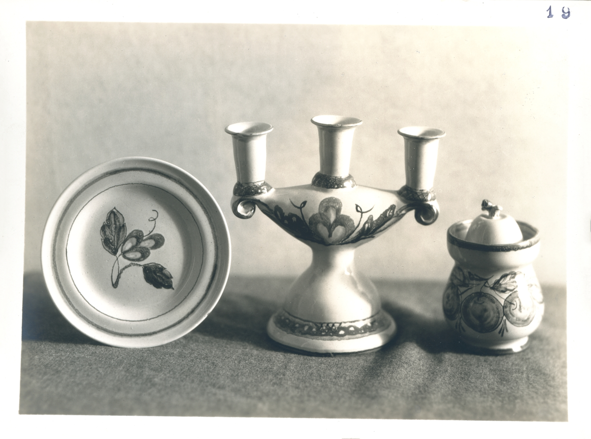 Assiett, liten trearmad ljusstake samt en liten skål med lock från Bo Fajans, tidigt 1900-tal.