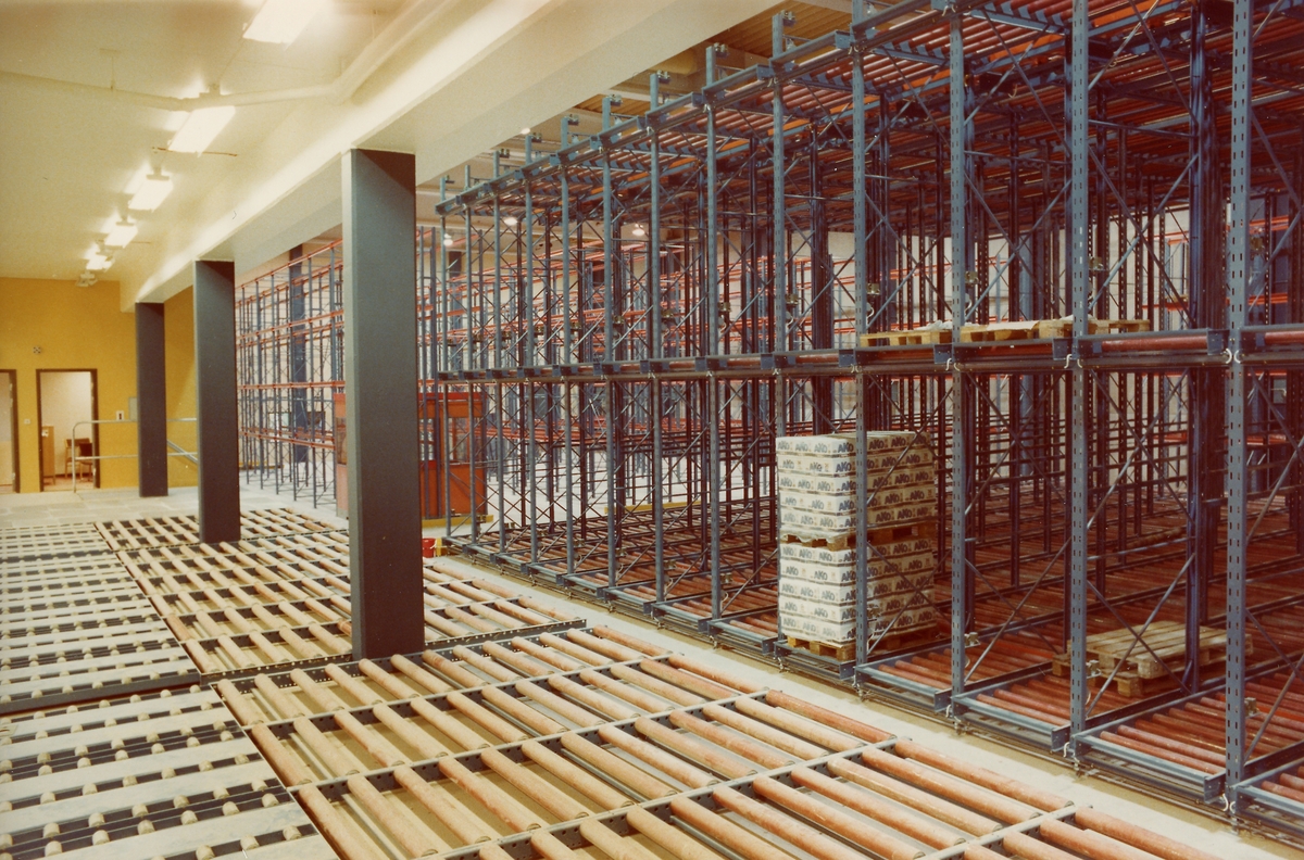 Lagret vid Ahlgrens tekniska fabrik. Pallhyllor, pallrullor, lastkaj.