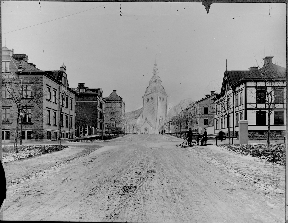 Förslag till kyrka för Staffans församling, Brynäs. Manipulerad bild där kyrkan är belägen på krönet av Brynäsgatan invid Brynässkolan.